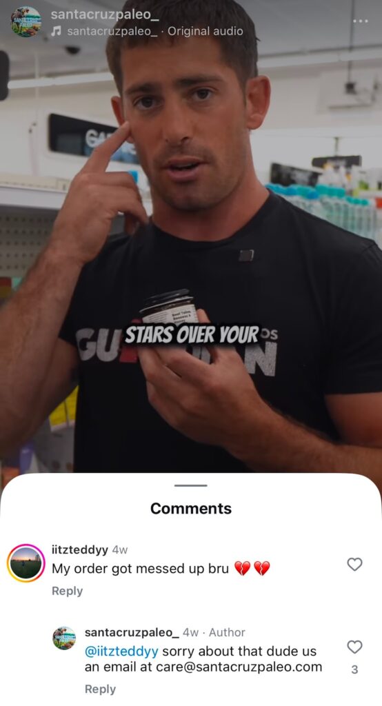 The Santa Cruz Paleo social media accounts respond to all comments, even if they are complaint driven or negative. This shows that they are “actively participating in social listening and monitoring”. For example, a number of consumers who experienced order issues received direct responses in the comment sections, and the brand even shared screenshots of helpful conversations from their direct messages. This level of transparency reinforces trust. Additionally, the brand responds to more lighthearted or humorous comments, which helps them come across as relatable, a clear step beyond the typical automated response process.